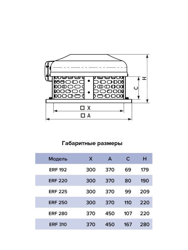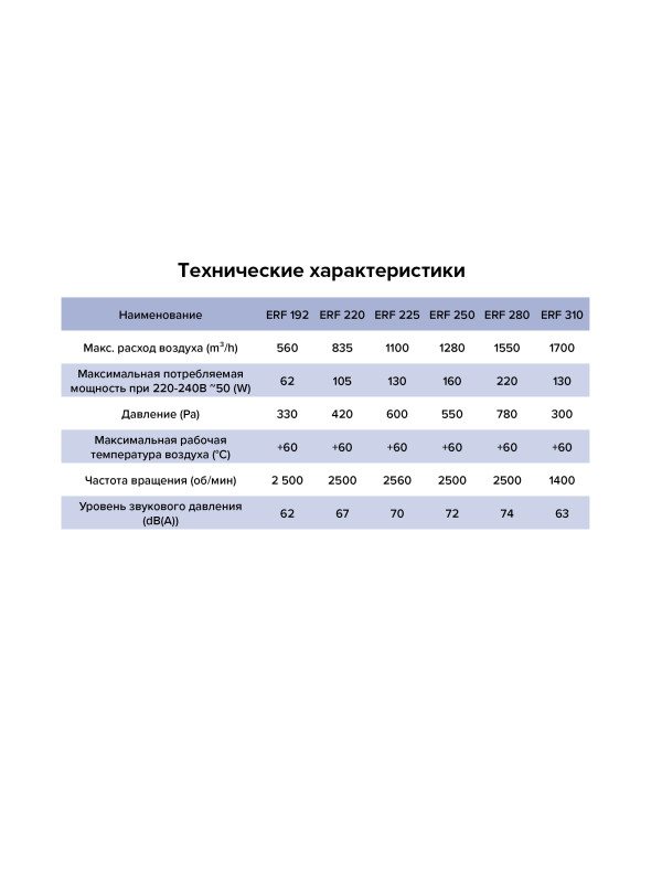 В ERF установлен асинхронный однофазный электродвигатель, который оснащен внешним ротором и якорем с высоким омическим сопротивлением, имеет многоразовую защиту от перегрева с автоматическим перезапуском, защиту от влаги и мелких частиц IP54. Повышенную надежность, долговечность электродвигателя, способность выдерживать высокие температуры обеспечивает изоляция класса F. Корпус вентилятора изготовлен из оцинкованной стали и дополнительно защищен полимерным покрытием от воздействия окружающей среды